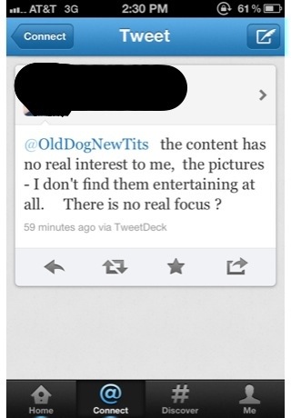 Short of calling me fat, I’m not really sure what’s left. Still … I’m new to this whole blogging game so I decided to poke around his Twitter account to see if I could learn anything from someone who’s clearly been around the block a few times and knows what he’s talking about. He’s a dentist … or a “dental enthusiast” of some sort … so everything centers on that. I’m not even sure why he’s following me except that he probably accidentally typed ‘tits’ when he meant to type ‘teeth’ in the search field. It happens all the time. (Cough.)