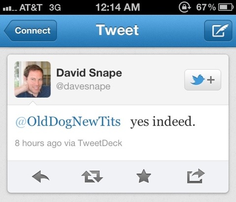 When I first wrote about my critic, I used a funky iPhone app to blacken out his name (out of respect?) from the screen captures of our Twitter conversation. And, as you may recall, several of my friends came to my rescue and had a little fun with him on Twitter resulting in each and every one of them being blocked from his account. But not me. ??? It sort of blew my mind … since I tweeted repeatedly about the whole incident.