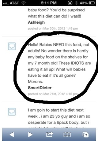 First things first, Vanessa (my dieting partner in crime and Ethel to my Lucy) and I needed to make a grocery run. I haven’t had baby food in the house in years. And, if there’s one thing I can attest to so far with this diet, it’s that it will make you laugh. Your ass off. Ever since we hatched this scheme over lunch yesterday, we’ve laughed so hard in the planning and research process that we can barely breathe. Like when we found this comment among the long list on DietsInReview.com …