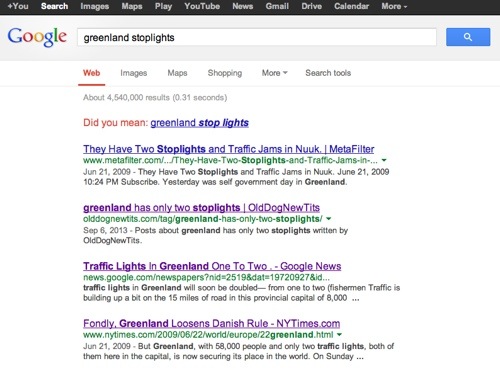 Thanks so much for writing back. I can only imagine how busy an employee of a tourism office that covers such a vast and interesting expanse of the world must be. You are correct about my wanting to visit your country as a travel writer. I review all kinds of products ranging from trendy, high-end headphones to blockbuster horror films to children’s books about underwear. So why not Greenland, right? Of course, right..Because you know the area so well, you would likely be a great person to point me in the direction of the cities or regions I should contact directly about a visit. I would love your advice or the advice of anyone there in your office. You guys are the experts. And, with a little luck, I will be one day soon as well. (What an honor it would be to call myself a Greenlandic Expert!) I’ve been reading up on your country non-stop and I’ve learned that all of your cities are established on the coastline because it’s the only area that is ice-free. I also know that Greenland has only two stoplights, both located in Nuuk, your country’s capital. When you google that traffic light fact, my website is now the second listing that comes up for that information (see below)...Suffice it to say, visiting Greenland to write all about it is definitely at the very top of my Bucket List. (Do you guys know the expression “Bucket List” in Greenland? I’m afraid that term would not translate literally. For that reason, I’ve included a Wikipedia link explaining it here: http://wiki.answers.com/Q/What_does_’bucket_list’_mean. Additionally, there was a movie made about this concept appropriately titled The Bucket List starring Jack Nicholson and Morgan Freeman. Are you familiar with these American actors? I heard the movie was pretty good but I never actually saw it myself. Hey, maybe we could all see it together when I get to Greenland!).But I digress ….Yes, I want to visit Greenland. As soon as possible. Ideally, it might be nice to visit on June 21, your national holiday, but I’ll gladly come there any day of the year. Except Christmas (December 25). I’m a mom and I should probably be home for that day. 🙂.In the meantime, can you do me two favors?.