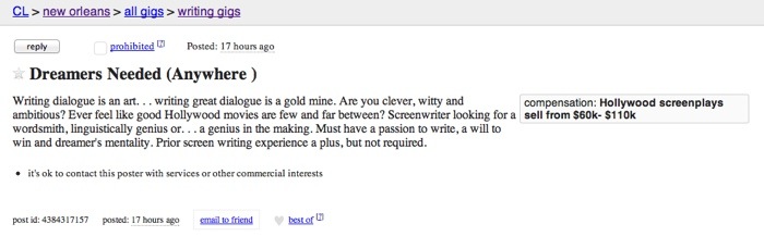 Because I know it’s hard to read: “Writing dialogue is an art. Writing great dialogue is a goldmine. Are you clever, witty and ambitious? Ever feel like good Hollywood movies are few and far between? Screenwriter looking for a wordsmith, linguistically genius or a genius in the making. Must have a passion to write, a will to win and a dreamer’s mentality. Prior screenwriting a plus, but not required.”