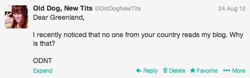 The darker the color, the greater the ODNT readership in that territory. Notice the vast white land mass in the top center. Those are my haters in Greenland.