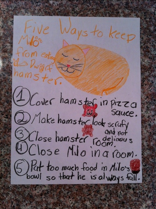 (2) Make hamster look scruffy and not delicious. As far as humans are concerned, this would seem an easy task (unless he’s covered in cheese … or possibly chocolate). As far as Milo is concerned, I can’t imagine that his feline tastes are so discerning that a little unkempt fur or stench of urine would hold him back. After all, I’ve seen him eat a roach.
