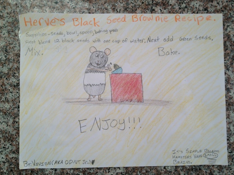 So anyway, without further ado … I give you the first of the ODNT, Jr. Vote for My Mom for Top 25 Funny Moms original creations. This one is entitled “Herve’s Black Seed Brownie Recipe.”