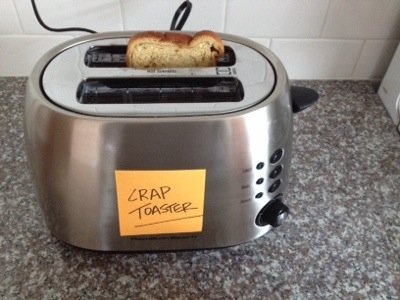 Regarding that comment about the warranty expiring, we just bought the toaster on October 25. It’s been three weeks. Maybe it has a really short shelf life. Like milk … or today’s celebrity marriages. (Oh, relax, Hanks, Bacons and Osbornes. You know I’m not talking about you.)