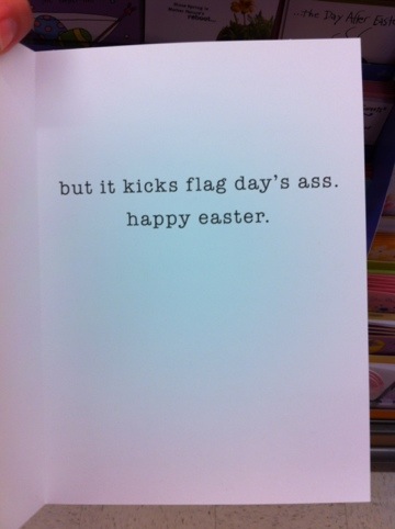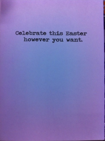 I’ll lead with these two … both of which simply say ‘Happy Easter’ inside … since I already tweeted them earlier. I’m a Catholic girl, born and bred, so I think it’s okay that I’m laughing. Or maybe now I’m going to hell. Just remember, if you laugh, you’re going with me. (Please bring sunscreen. Ooh, and beer.)